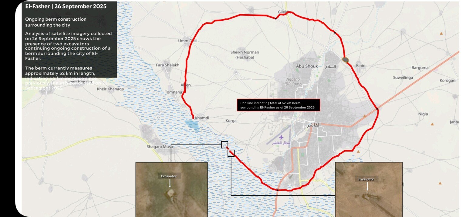 ووفقاً لتحليل صور الأقمار الصناعية، امتدت المتاريس الترابية التي شيدتها قوات الدعم السريع حول الفاشر إلى أكثر من 68 كيلومتراً، ولم يتبق سوى مسافة لا تتجاوز 4 كيلومترات قبل اكتمال الطوق العسكري. كما عززت القوات نقاط تفتيش عند طريق الفاشر–كتم وبوابة مليط، ما يقلص فرص المدنيين في الهروب الآمن.