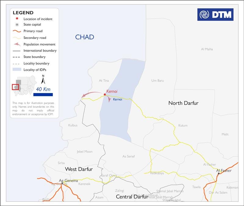 كشفت منظمة الهجرة الدولية عن نزوح 250 شخصًا يومي الثلاثاء والأربعاء من منطقة كرنوي بشمال دارفور، بسبب صراع قبلي.
